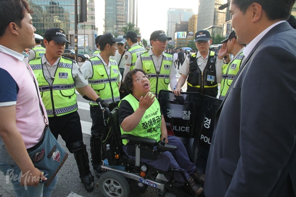 농성 1011째인 28일, ‘그린라이트’ 중 횡단보도를 통해 건너려는 것을 경찰이 막아서자 장애인 활동가가 이에 항의하고 있다.