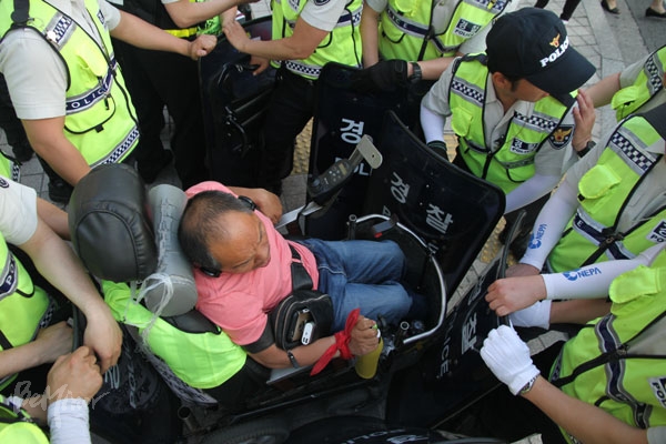 농성 1011째인 28일, 종로구 세종로 일민미술관 앞에서 휠체어를 탄 장애인 활동가가 경찰에 둘러싸여 있다.