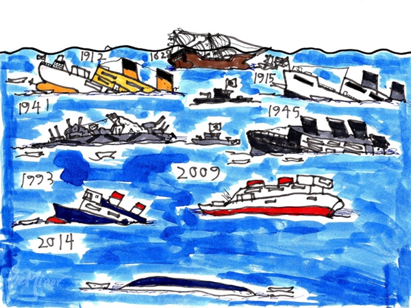 17세기부터 21세기까지 인간의 실수로 혹은 전쟁 등으로 침몰하는 군함, 여객선을 그렸다. 1628년 스웨덴의 바사호는 대포를 많이 실어가다 강풍으로 침몰하였고, 1912년 영국의 타이타닉호는 빙산 충돌로 침몰, 1915년 영국의 루시타니아호는 독일잠수함의 공격으로, 1941년 독일의 비스마르크호는 영국 해군의 공격으로, 1945년 독일의 빌헬름 구스틀로프호는 소련 잠수함의 공격으로 침몰, 1993년 한국의 서해페리호는 승객 초과에 강풍으로 침몰, 2009년 이탈리아의 콩코르디아호는 얇은 해협을 지나다 좌초 침몰, 2014년 한국의 세월호는 무리한 증축에 적재 한도 초과, 정부의 무능하고 무책임한 대응으로 침몰하였다.