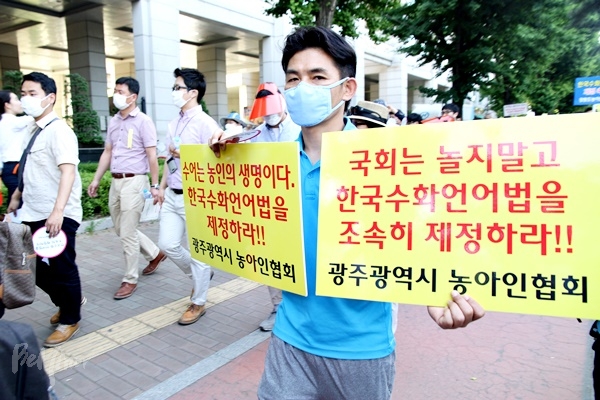 한국농아인협회는 3일 오후 3시 여의도 이룸센터 앞에서 수화언어법제정 촉구 기자회견을 열고, 현재 국회에서 논의가 공전되고 있는 수화언어법의 조속한 통과를 요구했다.