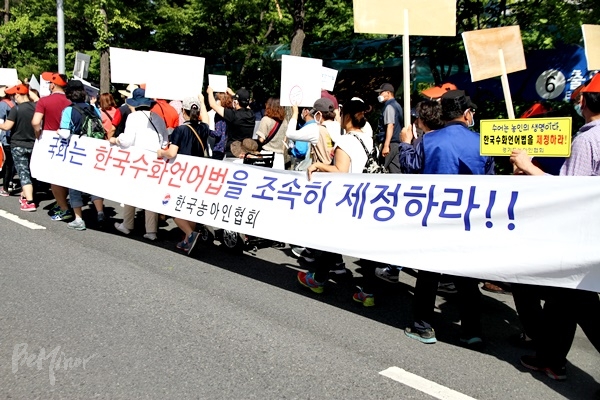 이들은 기자회견을 마치고 여의도공원 사거리를 돌아 국회 앞까지 행진해, 국회에 수화언어법 처리 촉구 의견서를 전달했다.