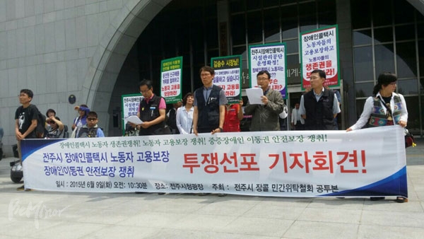 이로 인해 전주시 장애인콜택시 민간위탁철회를 위한 공동투쟁본부(아래 전주장콜공투본)는 9일 전주시청 앞에서 기자회견을 열고 전주시가 장애인콜택시 노동자들의 고용승계를 보장할 것을 촉구했다. 전주장콜공투본은 지난 2014년 9월 전주시에 장애인콜택시 민간위탁 철회와 전주시의 책임 있는 관리·운영을 촉구하며 출범했다.