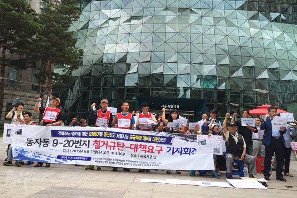 동자동 9-20 쪽방 세입자모임과 9-20 공동대책위원회는 11일 서울시청 앞에서 기자회견을 열었다. 이들은 안전을 위협하는 철거를 당장 중단하고 시가 적극적으로 개입해야 한다고 요구했다.