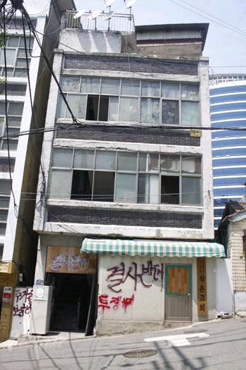 ![]() ▲철거 중인 동자동 9-20 건물. 철거에도 여전히 사람이 살고 있다. |