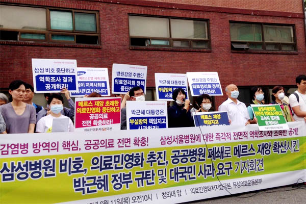 ![]() ▲메르스 사태를 방치한 정부를 비판하며 공공병원 확충을 요구하고 있는 시민사회단체 기자회견 모습 (출처: 보건의료단체연합 홈페이지) |