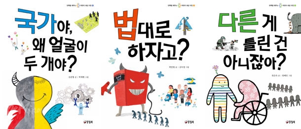 ![]() ▲양철북 출판사의 ‘반쪽을 채우는 어린이 세상수업 시리즈.’ 왼쪽에서부터 『국가야, 왜 얼굴이 두 개야?』, 『법대로 하자고?』, 『다른 게 틀린 건 아니잖아?』 |