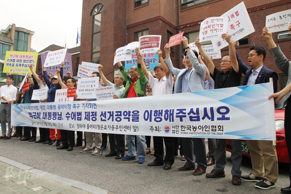 이에 한국농아인협회(아래 한농협)는 30일 청운효자동 주민센터 앞에서 기자회견을 열고, 박 대통령과 정치권이 약속대로 수화언어법의 조속한 제정에 나서달라고 요구했다.