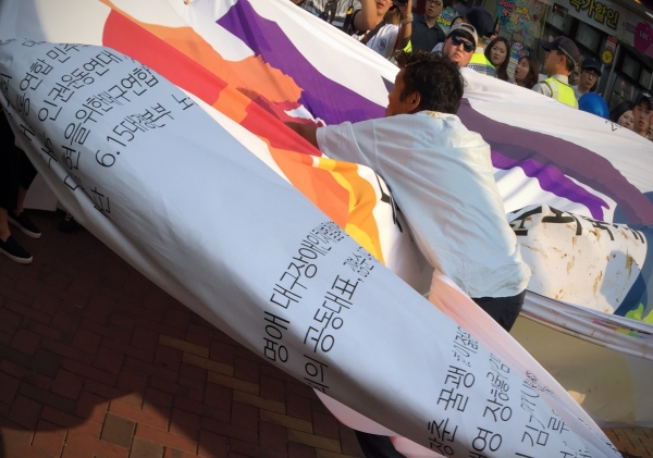 ![]() ▲대형 현수막을 들고 행진하는 사람들. ⓒ뉴스민 |