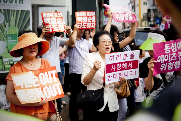 ![]() ▲'박원순 OUT''동성애 OUT' '여러분을 사랑해서 반대합니다!' 등의 피켓을 들고 구호를 외치는 기독교단체 회원들. ⓒ뉴스민 |