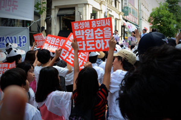 ![]() ▲'동성애 홍보대사 박원순을 타도하자'라는 피켓을 머리 위로 치켜든 한 여학생의 뒷모습. ⓒ뉴스민 |