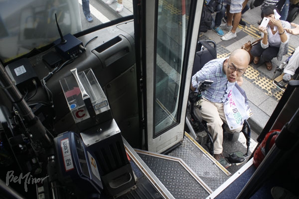 ![]() ▲휠체어째 탑승할 수 있는 편의시설이 없어 휠체어 탄 장애인이 광역버스 앞에 멈춰서 있다. |