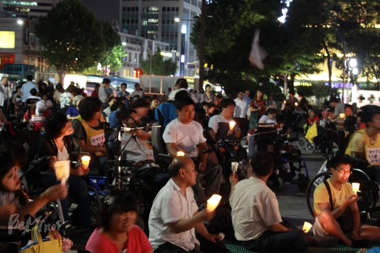 ![]() ▲ 400여 명의 중증장애인들이 촛불을 밝히며 MB정권의 '가짜 복지'를 규탄하고 있다. |
