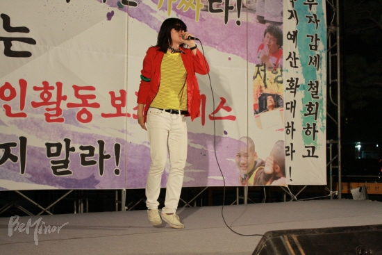 ![]() ▲'MB정부 가짜복지 규탄! 장애인활동보조살리기 촛불문화제'가 종로 보신각 광장 앞에서 열렸다. 열창하고 있는 노동가수 지민주 씨. |