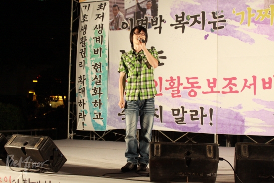 어둠이 내리기 시작한 종로. 저마다의 길을 향해 달려가는 도심의 한복판, 400여 개 촛불이 MB정부의 '가짜 복지' 아래 보이지 않는 생존의 길을 찾기 위해 불을 밝혔다. 장애인의 생존을 위협하는 이명박 정부의 '가짜 복지'를 규탄하기 위해 노동가수와 자립 음악가들이 음악으로 연대하며, 노숙농성에 돌입하는 중증장애인의 초 위에 노래의 불씨를 나누었다. 'MB정부 가짜복지 규탄! 장애인활동보조살리기 촛불문화제'가 늦은 7시 30분 종로 보신각 광장 앞에서 열렸다.