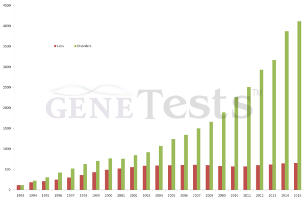 ![]() ▲유전자검사를 제공하는 전 세계의 실험실(적색)과 유전자검사 이루어질 수 있는 장애(녹색)의 증가를 보여주는 도표. 2001년만 해도 819가지에 머물렀던 장애의 목록은 급격한 증가가 이루어져, 2015년 8월 1일을 기준으로 무려 4,412가지 달한다(출처: www.genetests.org). |