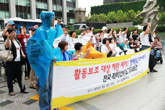전국장애인부모연대(아래 부모연대)는 10일 이른 11시 보건복지부 청사 앞에서 장애등급제와 활동보조 대상제한의 폐지를 요구하는 기자회견을 열고, 전국장애인차별철폐연대가 4일째 진행 중인 장애인활동보조살리기 노숙농성을 지지하며 앞으로 장애자녀 부모들이 노숙농성에 함께하겠다고 선언했다.