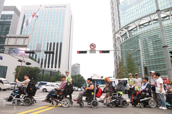 결의대회 이후 참가자들이 광화문역 장애등급제·부양의무제 폐지 농성 3주년 투쟁결의대회가 열리는 광화문 광장까지 행진하며 종로 1가 사거리를 점거하고 있다.