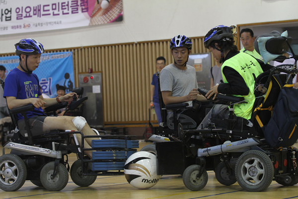 ![]() ▲전동휠체어를 타고 공을 빠르게 몰아가는 선수들. |