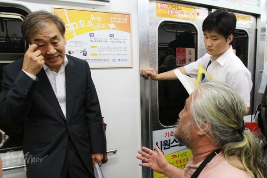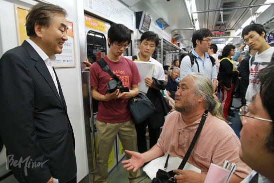 이 특임장관은 출근길에 불쑥 찾아온 이들을 반기지 않는 기색이 역력했다. 연신내역에서 경복궁역까지 10여 분 만나는 동안 이 특임장관은 “출근하는 시민들에게 피해를 주면 안 되지 않느냐” “때와 장소라는 게 있는데 이렇게 데모하듯 하면…” “지하철로 출근도 못 하게 만드시네” 같은 말들을 전하며 난감한 기색을 감추지 않았다.
