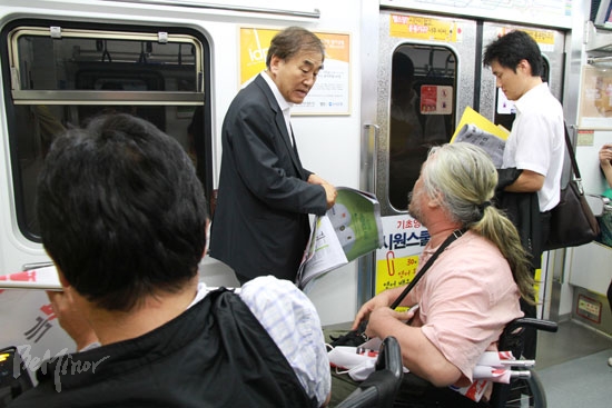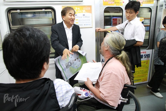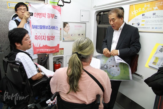 지난 7일부터 서울 종로 보신각 앞에서 ‘장애인활동보조 살리기’ 노숙농성을 하고 있는 전국장애인차별철폐연대(아래 전장연) 소속 활동가들이 13일 아침 6시경 지하철 3호선 열차를 타고 출근 중인 이재오 특임장관을 만났다.