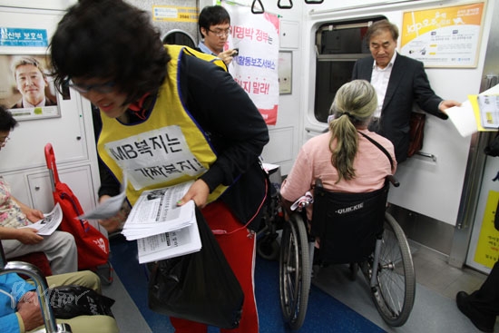 ![]() ▲이재오 장관과 박경석 대표가 이야기를 나누고 있는 동안, 'MB복지는 가짜복지'라는 몸띠를 걸친 한 활동가가 열차 안 시민들에게 농성 관련 전단을 나눠주고 있다. |