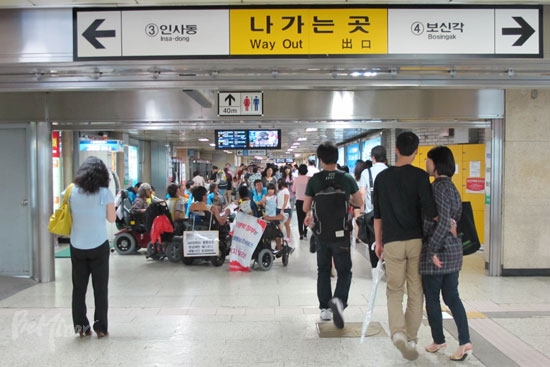 ![]() ▲지하철을 타고 출근하는 이재오 특임장관과 보신각에서 7일째 노숙농성 중인 전국장애인차별철폐연대 회원들이 만났다. |