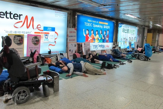 ![]() ▲농성 5일째 종각역 안에서 노숙하고 있는 전장연 활동가들. |