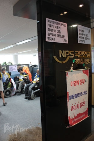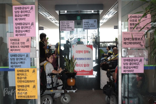 ![]() ▲'이명박 정부는 장애인활동보조서비스 죽이지 말라'라고 적힌 현수막이 장애심사센터 입구에 걸려있다. |