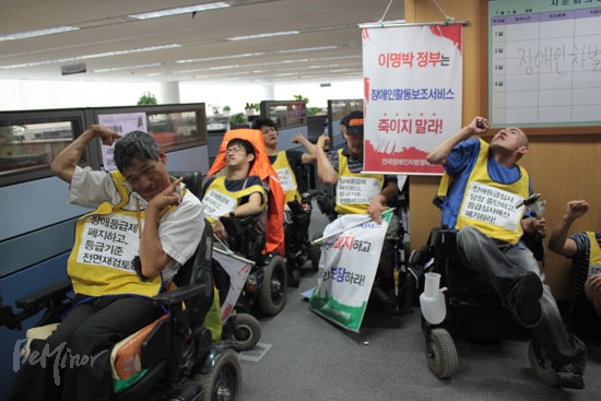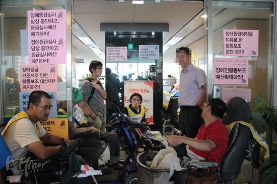 ![]() ▲장애심사센터를 점거하고 구호를 외치는 장애인들. |