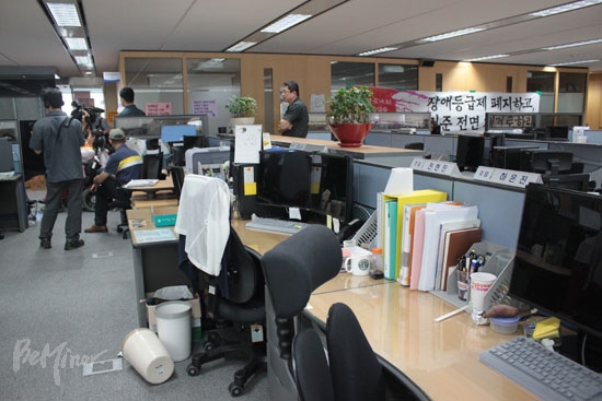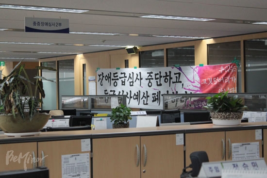 ![]() ▲장애심사센터 한쪽 벽에 '장애등급심사 중단하고 등급심사예산 폐기하라'라고 적힌 현수막이 걸려있다. |
