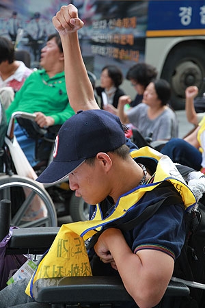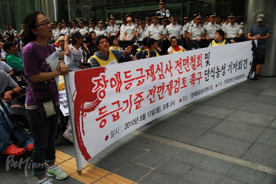 장애등급심사 중단 등을 요구하며 전국장애인차별철폐연대(아래 전장연) 박홍구 공동대표 등 중증장애인 19명이 13일 늦은 2시 단식농성에 들어갔다. 이들은 단식에 앞서 서울 광진구에 있는 국민연금공단 장애심사센터를 이른 11시경 점거했다.