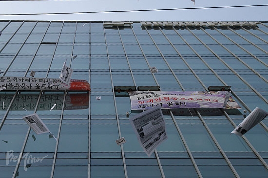 ![]() ▲농성자들이 건물 외벽에 내건 현수막. |