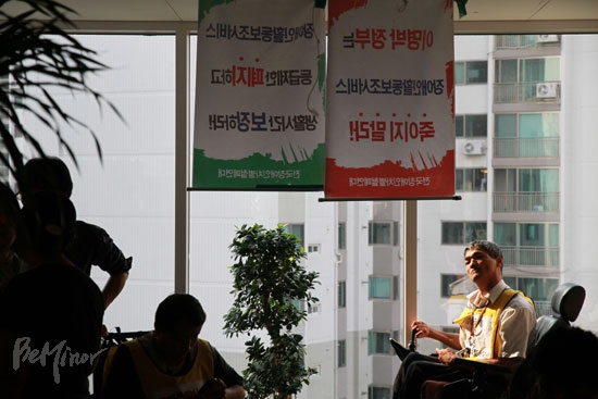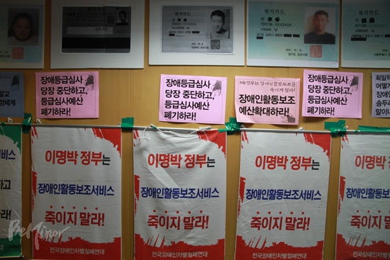 ![]() ▲장애인 복지카드를 비롯, 농성장 벽면에 붙여놓은 여러 선전물들. |