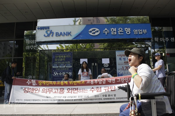 장애인 의무고용 미이행으로 지난 4년간 고용부담감 10억여 원을 낸 수협중앙회에 장애인들이 직접 찾아가 의무고용률 준수를 요구했다. 전국장애인차별철폐연대(아래 전장연)는 22일 오전 송파구 수협중앙회 본사 앞에서 기자회견을 열고 장애인 고용에 대한 공공기관의 책임을 촉구했다.