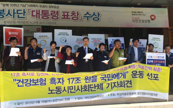 ‘건강보험 흑자 17조를 국민에게’ 운동이 얼마 전 200여 개 시민사회단체와 노동조합과 함께 첫발을 내디뎠다. 서울을 시작으로 각 지역에서 운동이 시작될 예정이다. 9월 23일 서울대병원을 시작으로 매주 홍보 캠페인과 서명운동도 시작된다. 이 운동에 많은 국민의 지지와 응원이 절실하다. 가장 중요한 것은 우선 건강보험 흑자를 내 주변부터 알리는 것이다. 여러 작은 움직임이 전국으로 퍼져나가 분노와 염원이 퍼진다면 우리는 이 운동에서 승리할 수 있다. 건강보험 흑자 17조를 국민에게! 모두의 건강할 권리를 함께 쟁취하자! (기사제휴=참세상)