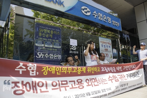 전국장애인차별철폐연대(아래 전장연)는 지난 22일 기자회견에서 수협이 최근 4년간 장애인 의무고용률을 지키지 않아 고용분담금만 10억 원 가까이 냈다는 사실을 지적하며, 장애인 고용의 책임을 다할 것을 촉구했다. 수협은 2015년 현재 장애인 의무고용 인원이 79명이지만, 8월 현재 44명의 장애인만을 고용하고 있다.