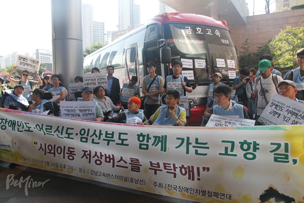 현재 전국에 시·도 간을 오가는 광역 및 고속·시외버스는 총 9574대. 이 중 서울과 경기를 오가는 광역버스 40대만 저상버스로 도입되었고, 시외·고속버스 중 장애인 등 교통약자가 탈 수 있는 버스는 한 대도 없는 실정이다.