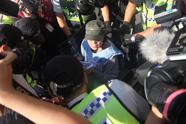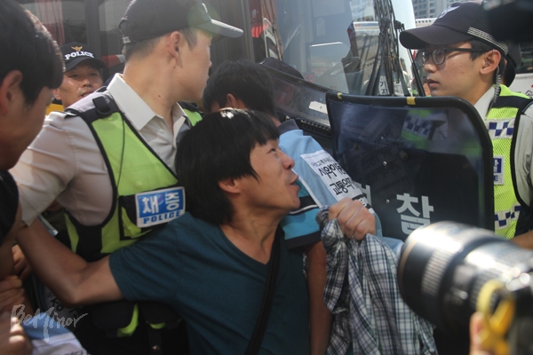 기자회견을 마친 후 이들은 미리 예매한 버스표에 적힌 오후 3시 10분에 맞춰 버스를 타기 위해 이동했다. 이들이 미리 예매한 버스표는 남원행 4장, 논산행 1장, 익산행 1장, 당진행 1장으로 총 7장. 그러나 이들의 시도는 버스 출입구에 가기도 전에 경찰 방패에 가로막혀 좌절됐다. 논산으로 가고자 했던 이정훈 전장연 정책국장(지체장애 2급)은 “현재 논산에서 군인 생활을 하고 있는 교회 동생을 면회하러 가고 싶었다. 동생에게 너무 미안하다”며 “이 억울한 사실을 국방부에도 좀 알려 달라”라고 목소리를 높였다.