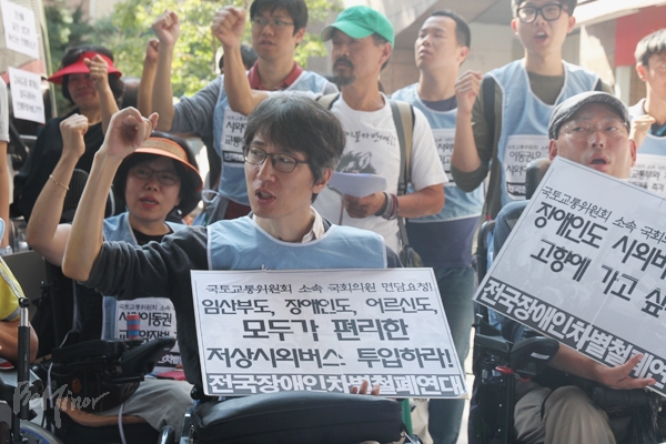 사진은 장애인 활동가들이 시외 저상버스 도입을 요구하며 구호를 외치고 있는 모습이다.
