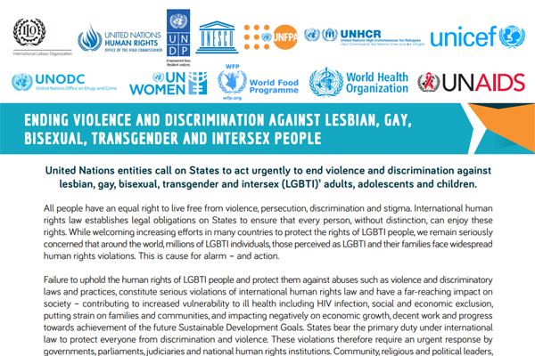 국제노동기구(ILO), 유엔인권최고대표사무소(UNCHR), 유엔아동기금(UNICEF), 국제보건기구(WHO) 등 12개 기구는 지난 9월 29일 “레즈비언, 게이, 바이섹슈얼, 트랜스젠더, 인터섹스(LGBTI)에 대한 폭력과 차별을 종식하기 위하여”라는 성명을 발표했다. 단일 기구가 아닌 공동명의로 성소수자 권리 보장 성명을 발표하는 것은 전례가 없는 일이다.