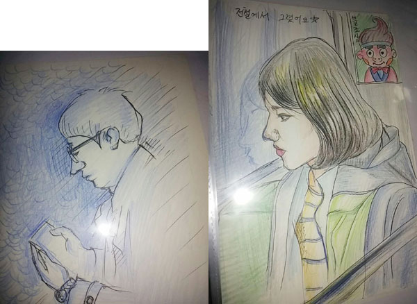 "전철에서 그렸어요. 연필로 스케치하고 나서 나중에 볼펜으로 그렸어요."