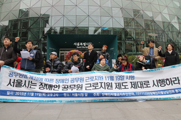 장애인차별금지추진연대(아래 장추련), 15771330 장애인차별상담전화 평지 등은 19일 서울시청 앞에서 기자회견을 열고, 서울 등 지자체가 개정된 국가공무원법, 지방공무원법 등에 명시된 대로 장애인 보장구, 근로지원인 제공 등을 준수해야 한다고 주장했다.