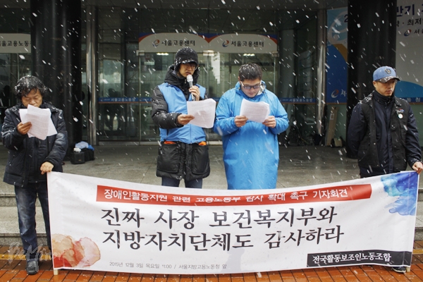 ![]() ▲활보노조는 3일 서울지방노동청 앞에서 기자회견을 열고, 노동부에 활동지원 제공기관뿐 아니라 복지부, 지자체도 감사하라고 촉구했다. |