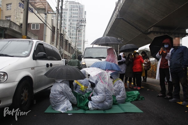 ![]() ▲지난 11월 29일, 커리어월드 공사 장비 차량 앞에서 연좌 농성을 하며 차량 진입을 막고 있는 반대 측 주민들 |