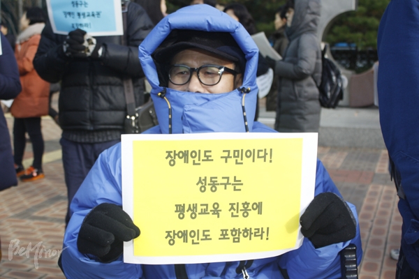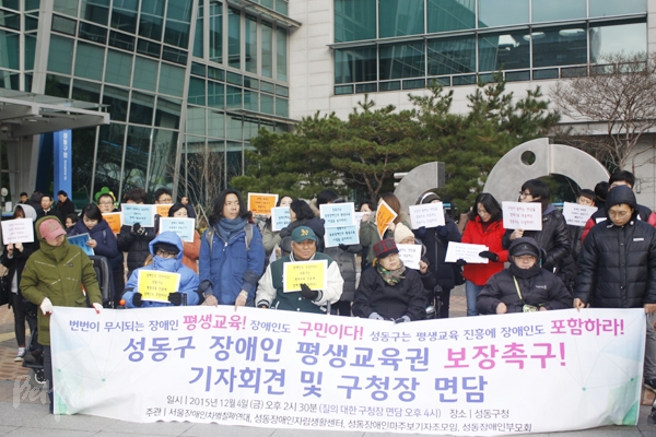 법과 조례 등으로 구민의 평생교육 권리를 보장하는 서울 성동구. 그러나 지역에서 사는 장애인과 부모들은 구내 평생교육에 장애인이 참여하기는 어렵다며, 성동구청장에게 장애인 평생교육 지원을 촉구했다.