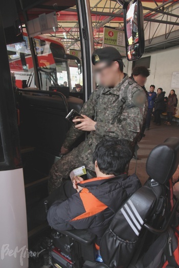 홍천이 고향인 한 참가자가 티켓을 들고 버스를 타려 했으나 휠체어 탑승 설비가 없어 탑승하지 못했다. 그 옆으로 한 비장애인이 버스에 올라타고 있다.