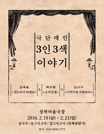 ‘3인 3색 이야기’는 성북마을극장에서 오는 19일 오후 8시, 20~21일 오후 3시, 6시 총 5차례 진행된다. 표는 1인당 1만 원으로, 인터파크, 옥션 등에서 인터넷으로 예매하거나 현장에서 구매할 수 있다.