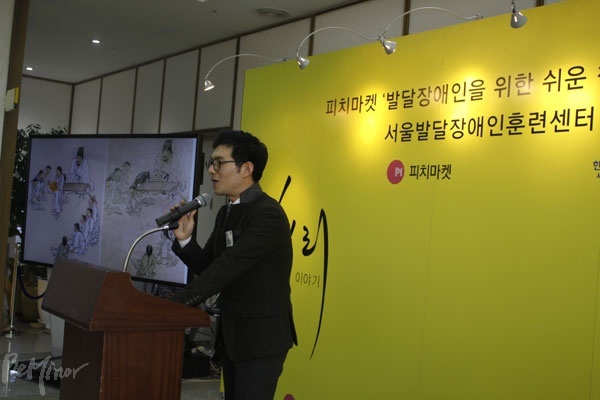 이번 책을 제작한 피치마켓은 발달장애인과 느린 학습자의 문화생활과 정서 함양을 위한 콘텐츠를 만들어온 단체다. 이번 책에서 피치마켓은 발달장애인의 눈높이에 맞춰 새로운 문법을 적용하고 어려운 용어는 별도의 설명을 덧붙였다. 또한 시각적 이해를 위한 삽화와 요약 만화도 삽입했다. 특히 이번 책에 삽입된 삽화는 발달장애인 당사자가 직접 그려 사람들의 이목을 주목시키기도 했다. 사진은 책 제작 과정을 발표하는 함의영 피치마켓 대표.