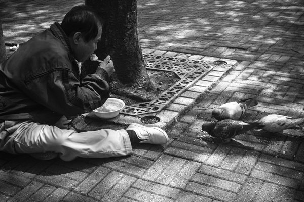 비둘기가 있고 쫓아낼 생각도 없는 이 봄날의 점심 한 끼는 최소한 심각해보이지는 않습니다. 하지만 길에서, 그것도 혼자서 먹는 밥 한 끼의 의미가 가볍지는 않습니다. “무거워보인다”는 것이 더 어울리는 묘사입니다. 아마도 진정 밥 한 끼를 위해서 마음속으로 우리는 살아있는 동안 수천 번 수만 번 끝없이 이 빈 그릇을 엎었다가 뒤집었을 것입니다.