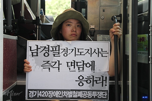 경기 지역 장애인들이 남경필 경기도지사가 장애인 생존권 보장을 위한 면담에 나설 것을 촉구하며 경기 광역버스를 점거했다.